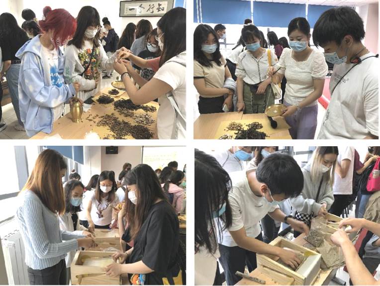 在活动最后,同学们前往教师现场体验传统艾条及香囊的手工做法。大家分工有序,饮片辨识、称重、捣药材、装香囊,各司其职,各学师生团队合作,共同完成了动手实践环节。在活动结束后,台港澳中医学部后期教学负责人张梦老师对本场实践的课后作业进行了布置。