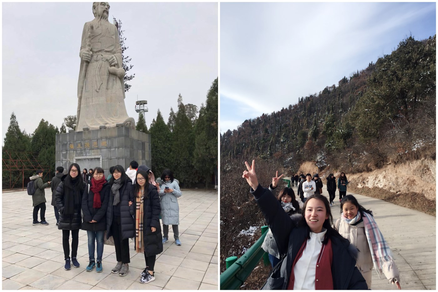 之后同学们又来到了位于附近的孙思邈的隐居地——药王山,同学们流连于古香古色的建筑和庙宇,对先人的智慧赞叹不已。当大家看到恢弘的药王孙思邈雕像后,都争先恐后的与其合影,以表达对中医的敬畏和向往之心。最后,师生们一行来到了大香山,切身感受悠久的佛教文化、美丽的雪景和祖国的大好河山。