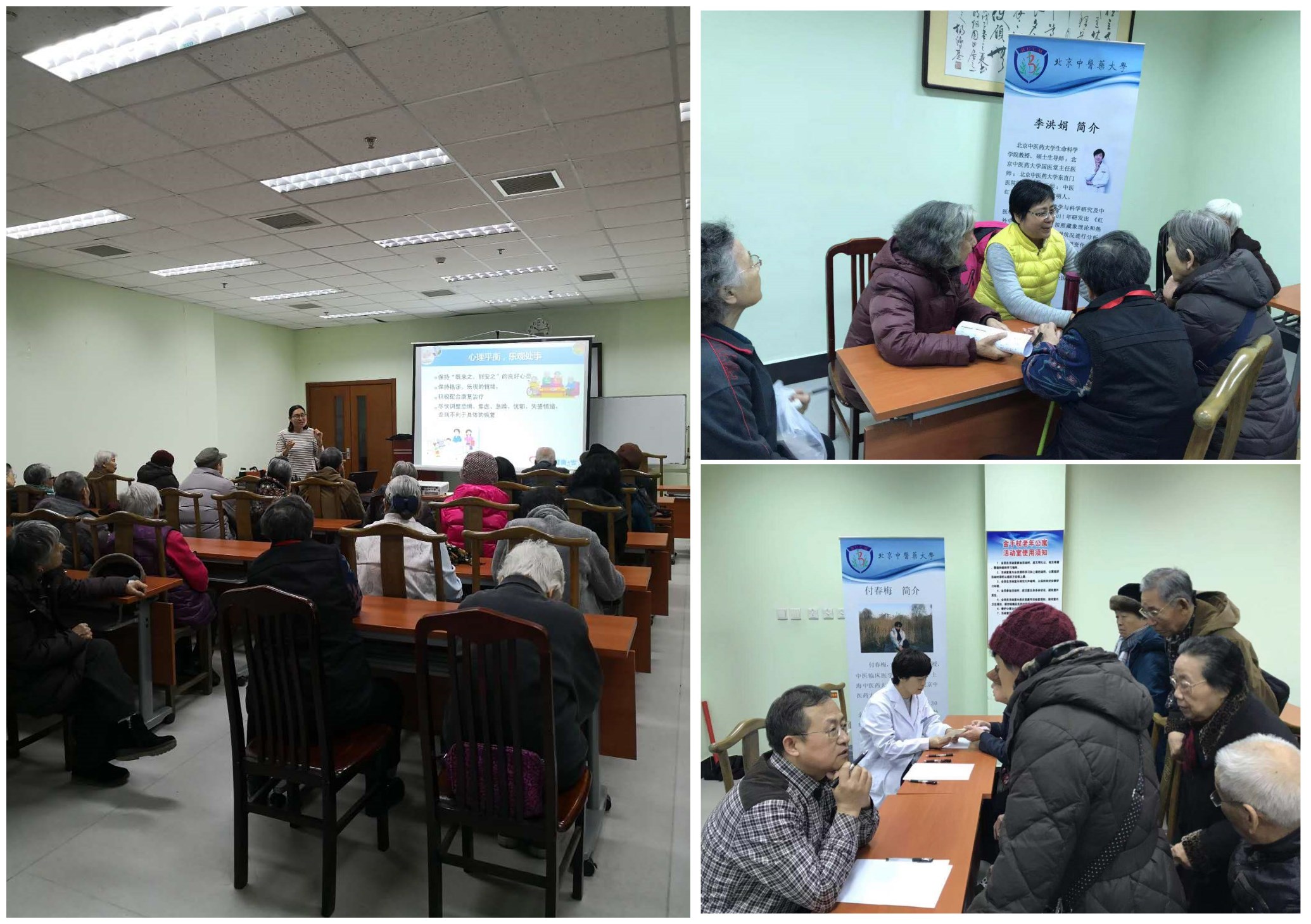 此次活动中,岳树锦副教授为老年朋友作了“中风的自我管理”的专题讲座,主要包括脑卒中的识别、卒中常用药物的注意事项,预防脑卒中的健康生活方式等内容。通过讲座提醒老年朋友早期识别脑中风的重要性,澄清老年朋友在卒中常用药物方面的认识误区。随后,李洪娟教授、付春梅教授、吴宏东副教授为老年朋友进行了义诊,同时对老年朋友提出的健康及诊疗问题进行了专业细致的解答,受到机构及老年朋友的一致认可及赞许。