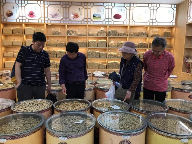 社员们首先参观的是安国药材交易大厅,还未进入大厅,浓郁的中药药香已经沁入心脾,这种独特的草药香味对社员们来说是那么熟悉和亲切。大厅中摩肩接踵,社员中不乏有中药鉴定专家,给大家介绍常用中药的识别与真伪鉴别,社员们不时地闻、尝、看,分辨不同产地、不同品质的药材,考察学习乐在其中!支社主委刘斌教授为此赋诗一首“祁州药市日日红,沉檀梅麝百味熏。邳彤佑护参茸旺,功荫子孙比神农。”