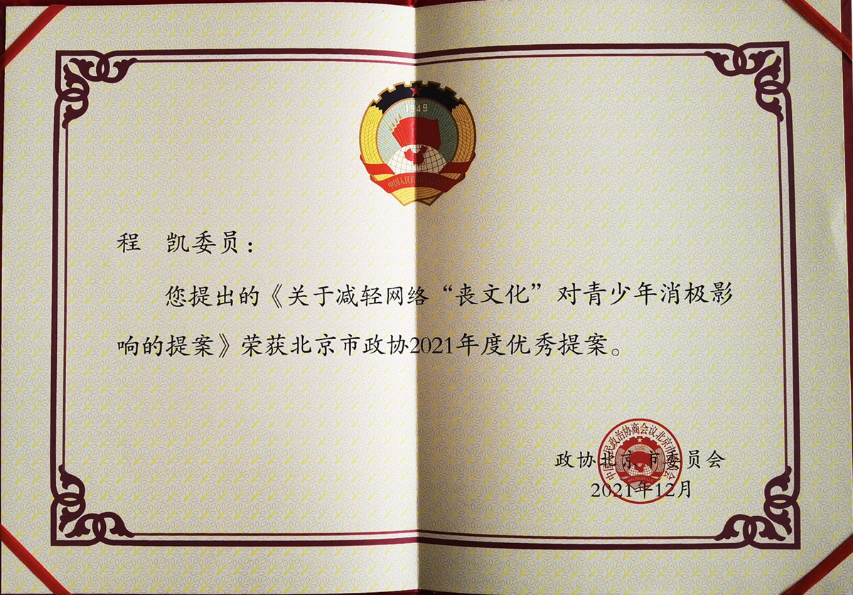 本次会议期间,我校市政协委员充分履职,共提交提案4项、建言献策2项,涉及中医药文化进校园、中医适宜技术进远郊社区服务站、完善卫生服务热线12320服务环节、青少年心理健康服务服务体系建设、协同育人体系建设、规范快递运营车辆等民生问题。其中,我校市政协委员、校知联会会长程凯教授2021年的提案《关于减轻网络丧文化对青少年消极影响的提案》荣获北京市政协2021年度优秀提案。