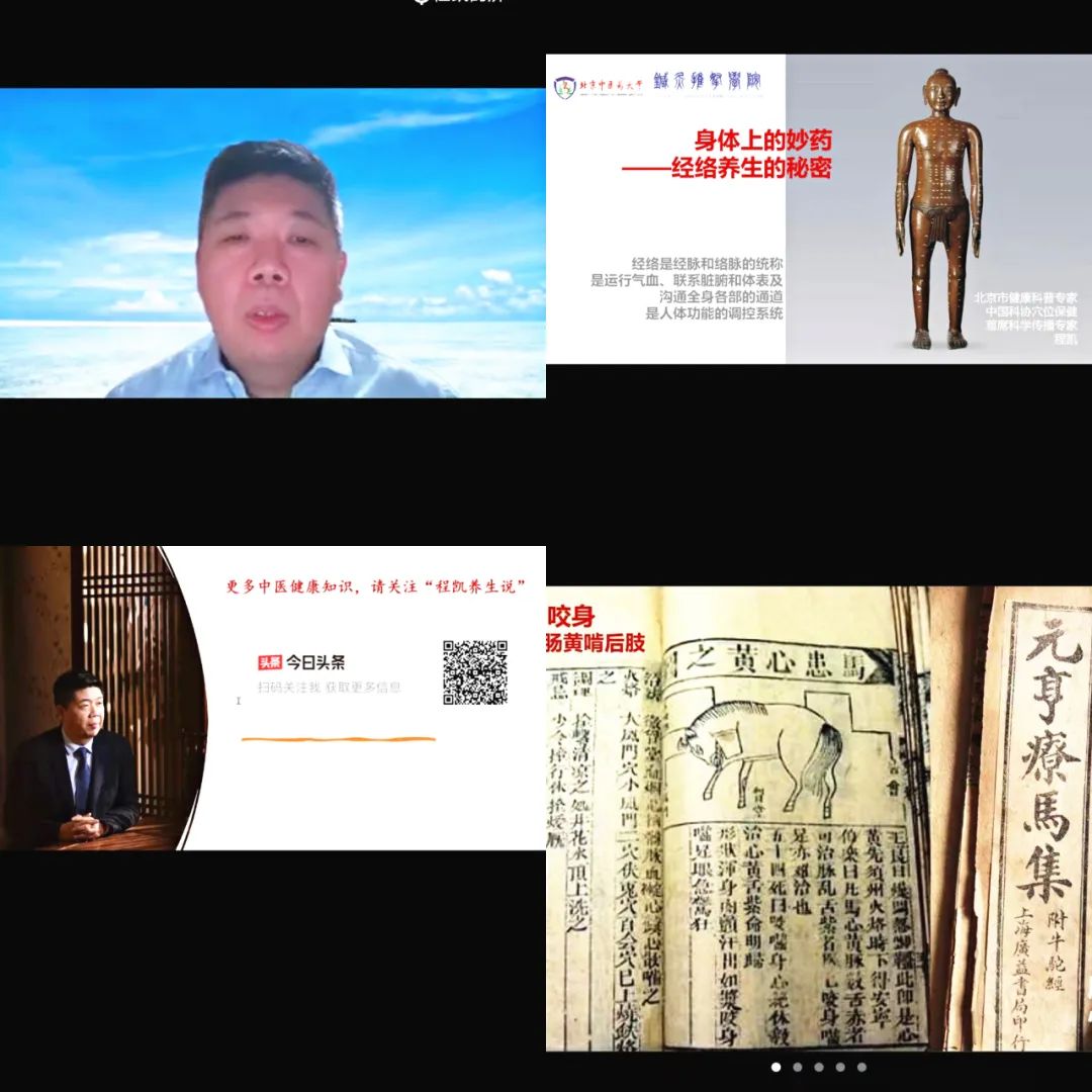 作为国家级非物质文化遗产保护项目“程氏针灸”第四代传承人,程凯教授疫情之下坚守岗位,坚持医保门诊及门诊教学工作,服务患者超1000余人次,带教学生100余人次。作为北京健康科普专家,他通过头条、抖音、百家号、微博、微信视频号、快手、哔哩哔哩等新媒体普及中医健康知识,开展线上公益健康直播20余次,受众超过20万人次。在近期朝阳区知联会“普潮学大讲堂”线上讲座上,他以“中医经络在防病治病中的应用”为题,从新冠肺炎治疗的中医思路、穴位刺激用于治未病的辩证思维、经络养生提升免疫力的主要方法等方面讲解了中医经络对于疾病预防和治疗的科学原理,帮助大家树立科学、健康、安全的防疫理念,筑好免疫“金钟罩”。