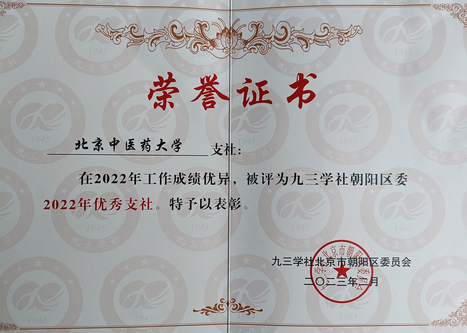 2022年,我校九三支社在全体社员的共同努力下,在思想政治、组织建设、参政议政、社会服务等方面取得了全面发展,获评2022年度优秀支社,连续5年被九三学社朝阳区委评为优秀支社,多名社员也获得了优秀社员、先进个人等荣誉称号。在参政议政方面,也获得朝阳区委2022年参政议政调研课题三等奖1项,建言献策被市政协采纳2篇,被九三学社市委、朝阳区政协采纳11项。在社会服务方面,社员们积极参加中医药科普宣传、义诊等活动,同时积极投入到各类防疫抗疫工作中,多次为防疫抗疫组织捐款捐物,为防疫抗疫工作贡献自己的力量。