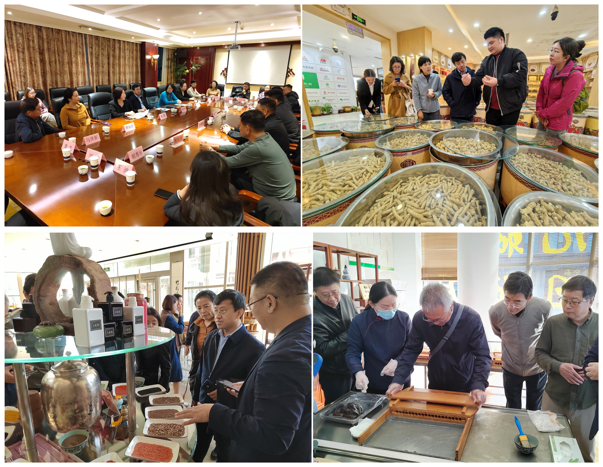 安国是我国著名的中药材集散地,素有“千年药都”“天下第一药市”之称,享有“草到安国方成药,药经祁州始生香”的美誉。调研考察团队与安国中药材产业协会、当地著名药材企业和药都国医馆的相关人员进行了座谈交流,随后走访了卫康药材有限公司、药都国医馆和安国药材市场,了解当前中药材种植、生产经营方面的发展态势及重要饮片炮制、加工、分类、鉴别等要点,体验中药蜜丸制作过程,全方位展望“药企+高校”在科学研究、人才培养、社会服务等方面的合作前景。