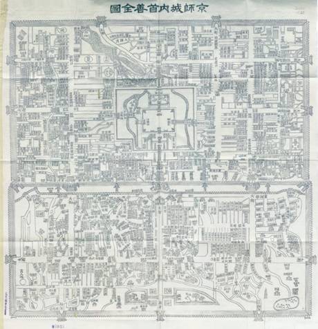 老北京建筑由于属平原型构成,在整体布局上呈现出总体整齐、规矩、方正的格局。强调向阳和坐北朝南。由于格局方正,所以院落之间形成的胡同也是很规矩的直线,并且以东西走向为多。一些胡同名字自带方位词,如西大胡同、东花枝胡同、南板桥胡同、北半截胡同等。这种城市格局使得北京人具有很强的方位感,直到今日北京人为外地人指路,仍喜欢说向东、往西、朝北等。(图5)