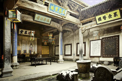 古徽州与老北京建筑虽然都受到儒家思想的影响,但两者之间还是有着一定的区别。该区别具体体现在古徽州受到儒教教化影响而老北京建筑受儒家文化影响。古徽州地区能够具体体现儒教教化的典型建筑为:祠堂和牌坊。虽然祠堂在江南村落中并不少见,但象古徽州地区拥有如此为数众多、规模宏伟、装饰精美的祠堂却不多见。祠堂是儒家祭祀祖先或者先贤的场所,主要用于祭祀祖先,也作为各房子孙办理婚、丧、寿、喜等的场所。家族内部的重要事务,也常在祠堂进行商议。古徽州地区存在的大量祠堂说明当地人们有极强的宗族宗法观念,这已经不属于儒家思想文化影响范畴,而是上升到儒教更进一步的层面。(图19)